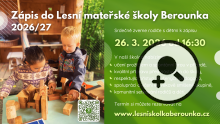 Lesní mateřská škola a ekocentrum Berounka srdečně zve rodiče ve čtvrtek 26. března od 16:30 k zápisu dětí na nadcházející školní rok.