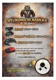 Pondělí 6 .4. 2026 na sále Stodolní hospůdky - lezení, kruhový trénink, kickbox - cena 20 Kč za hodinu, více informací v příloze.