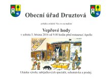 Obecní úřad Druztová pořádá a srdečně Vás zve na tradiční Vepřové hody v sobotu 5. 3. 2016 od 9.00 hodin před restaurací Apollo. Ukázka výroby zabijačkových specialit, ochutnávka a prodej.